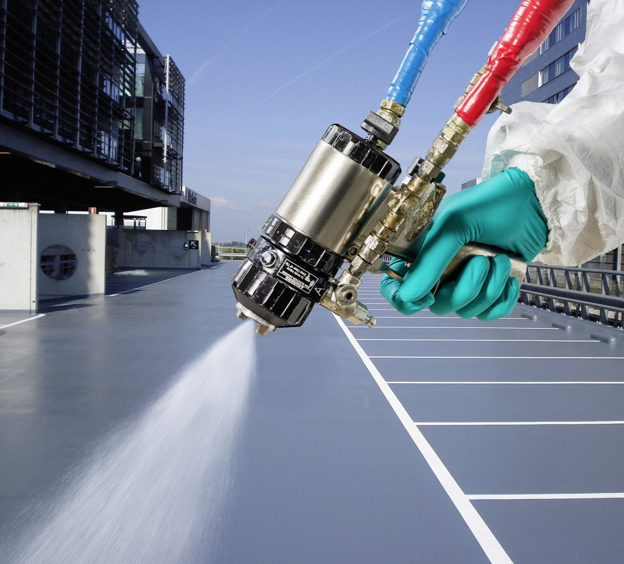 Aplicada sobre el soporte, la POLIUREA endurece a temperatura ambiente en segundos, formando un pavimento homogéneo, limpio y de altas prestaciones mecánicas.